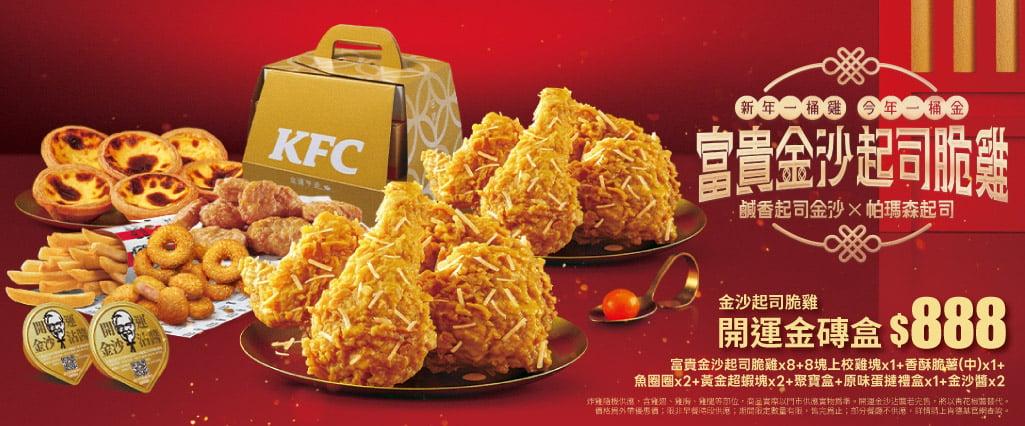 肯德基金運開年富貴金沙起司脆雞開運金磚盒「行走的財庫」!2/10限量開賣 7折優惠 $888發發發,送開運金棒棒春聯,外送輸碼再送蛋撻乙盒 開運補庫三部曲:除夕初一補財庫,初二送禮贈財庫、初五迎財神