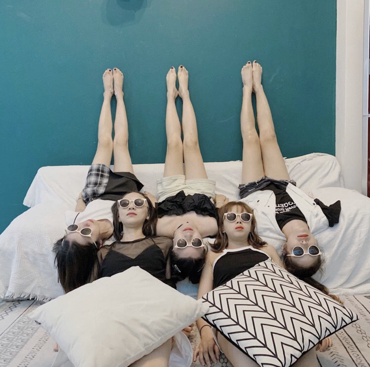 怎麼能放過露出美腿的時間!在拍搞怪照片之餘,也要和好姊妹們秀出逆天長腿。以住宿的飯店為背景,可利用躺著交錯位置來完成。進階版的話也可以將腳互相交叉,手相互牽起的方式,來達到一個照片和諧的境界,估計不能拍太久,以免會有腦充血的可能(笑)。