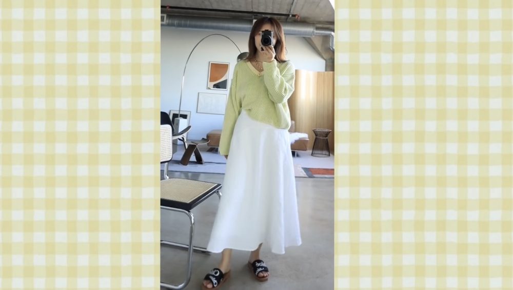 這種完全讓胖屁股、肉肉腿藏得超完美的喇叭型單品,真的是穿搭必備。因材質相同,在穿搭上可和上一件「繫帶長袖圓領衣」做搭配,仙氣立刻爆棚,但建議將衣服紮進去的效果會更好~