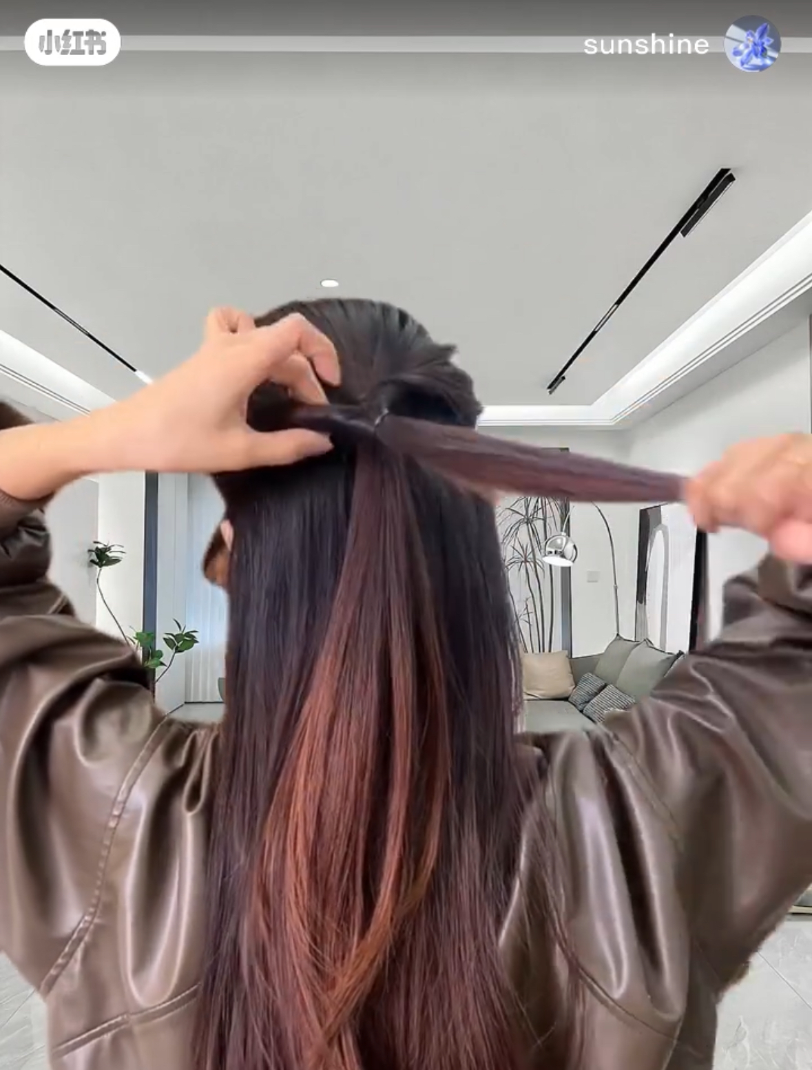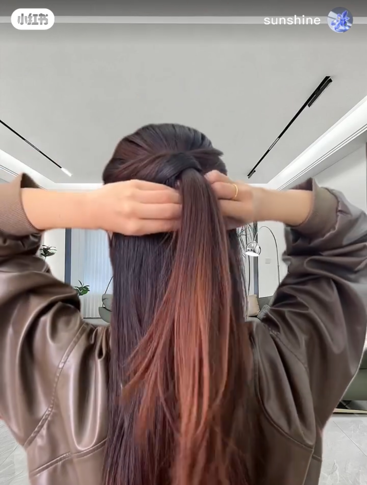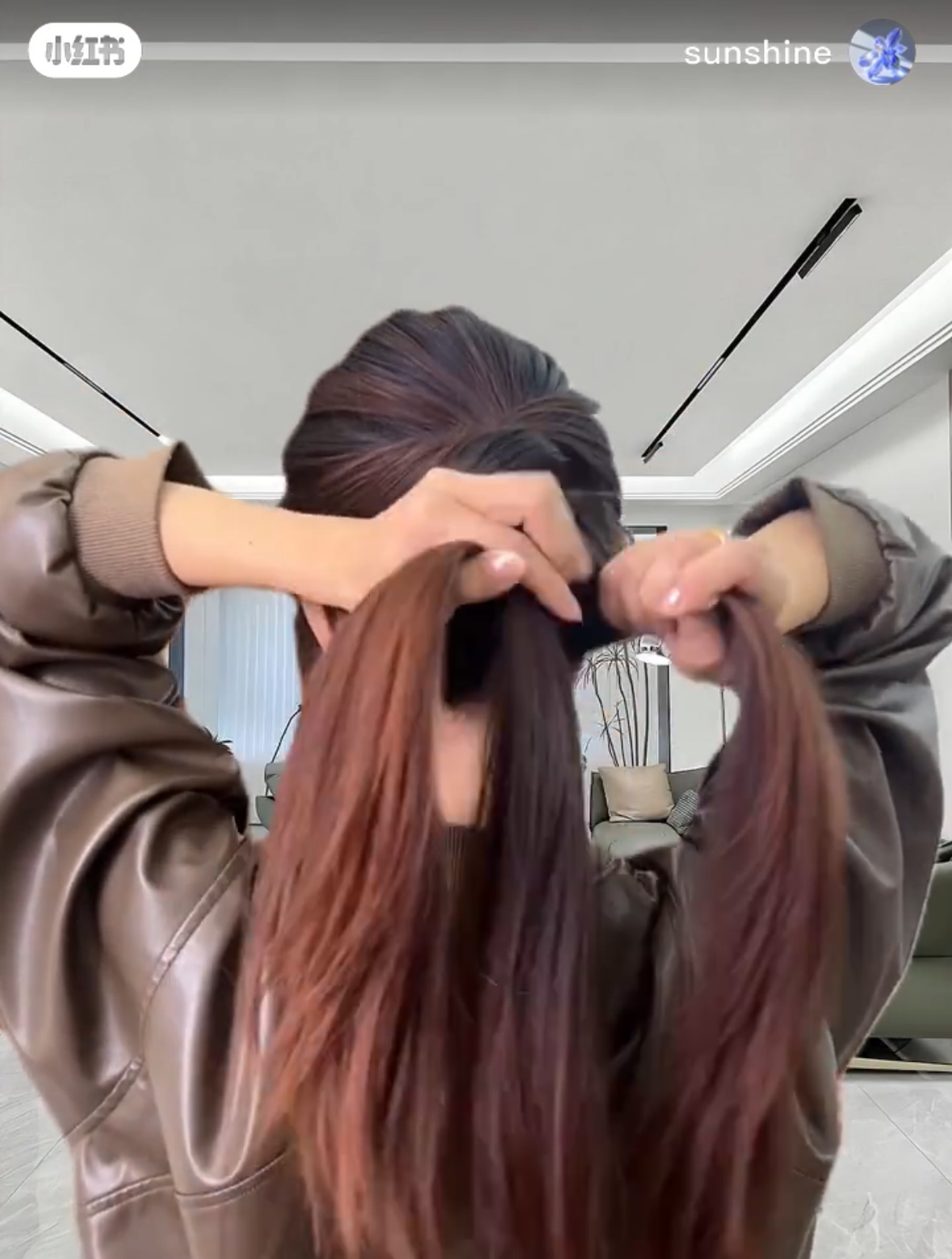 Step 2. 上部分的马尾中间撑开洞转两圈套在下部分的马尾