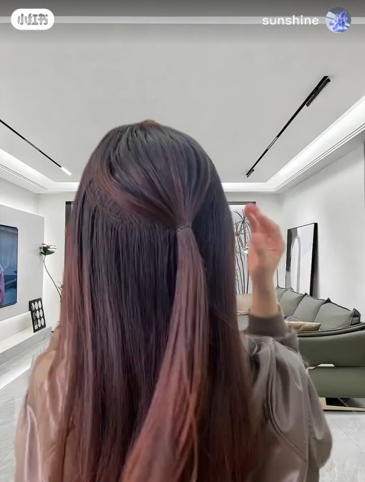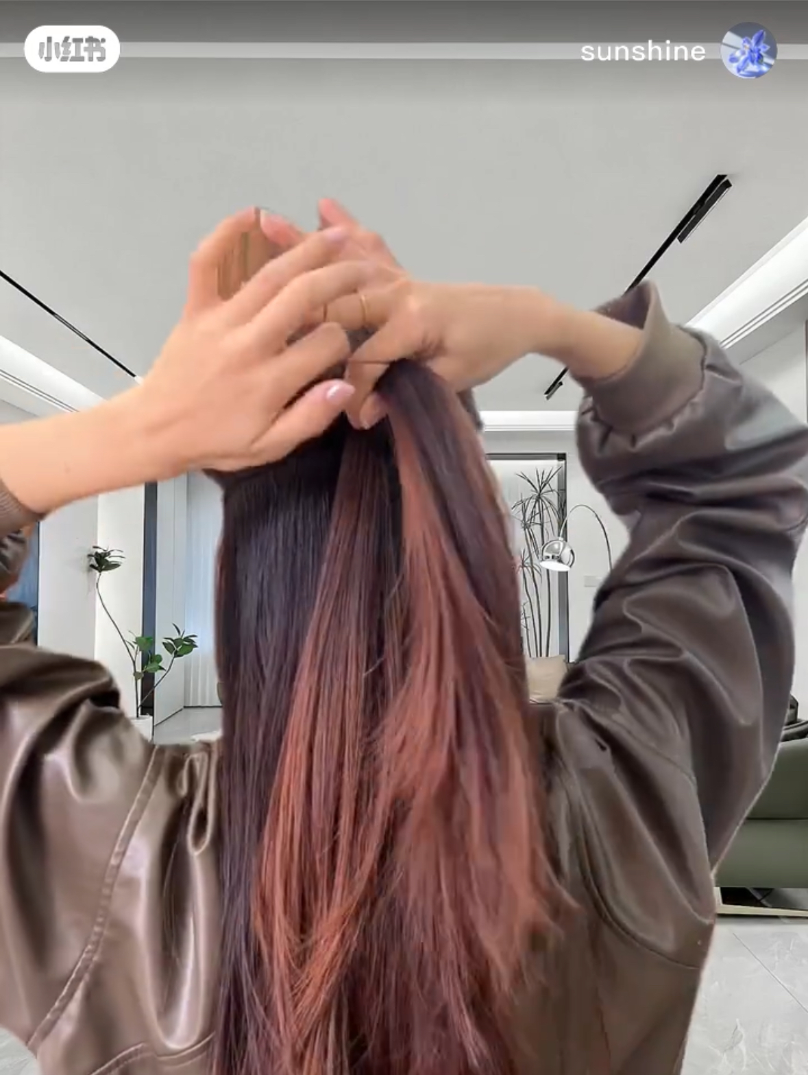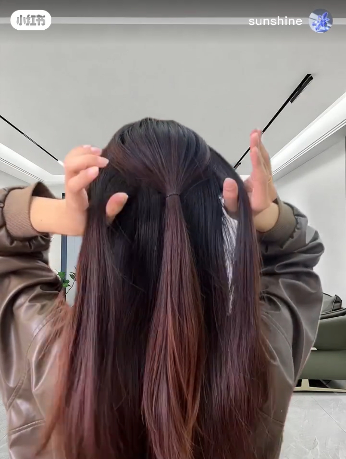 Step 2. 上部分的马尾中间撑开洞转两圈套在下部分的马尾