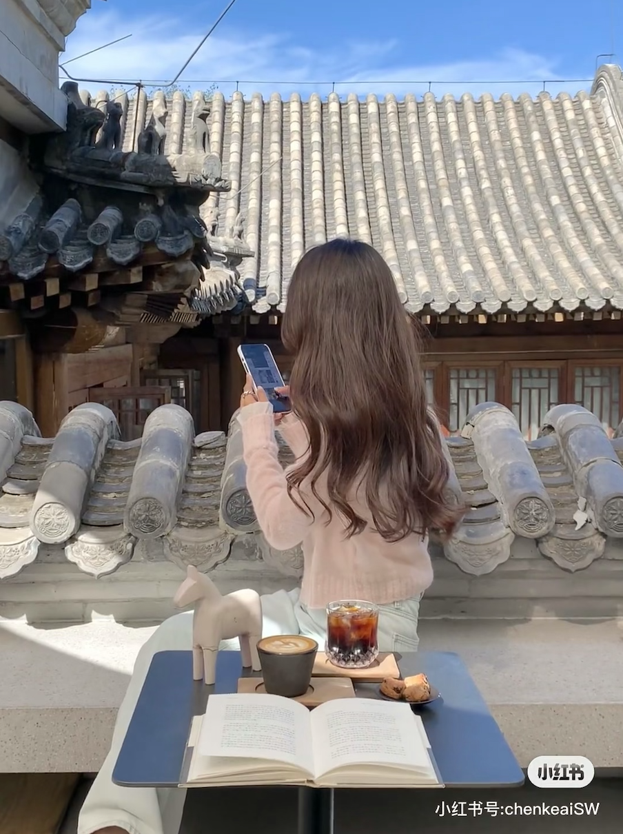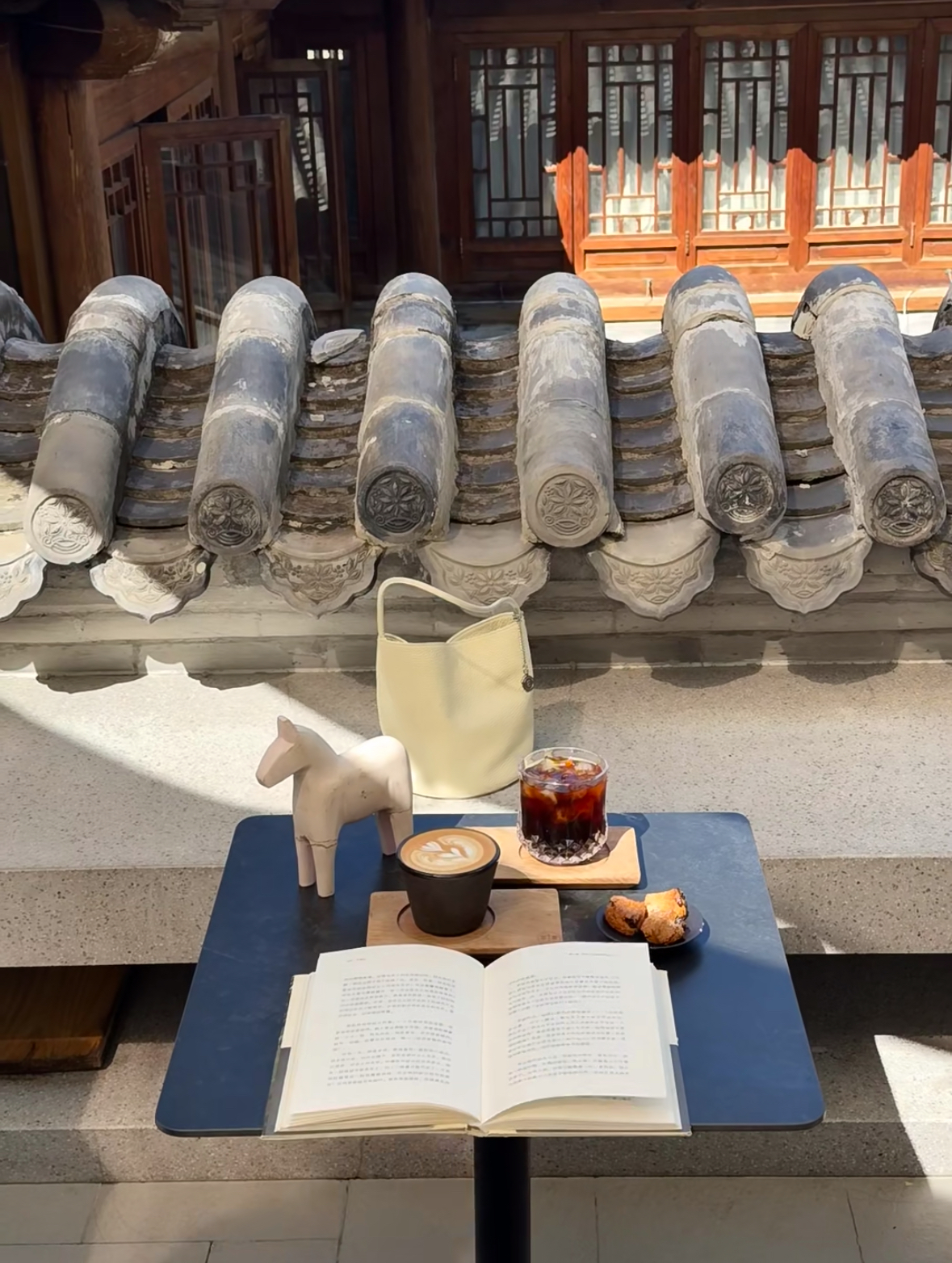 藏在南锣鼓巷深处的静水咖啡厅,是一座有着天窗的老北京四合院,走进门就像被时光包裹。阳光从天窗洒进室内,木头桌椅与水泥地构成极简的美学画面。最特别的是,这里还能“上房揭瓦”,真的可以登上屋顶俯瞰胡同风景,是拍照打卡的私藏好点。