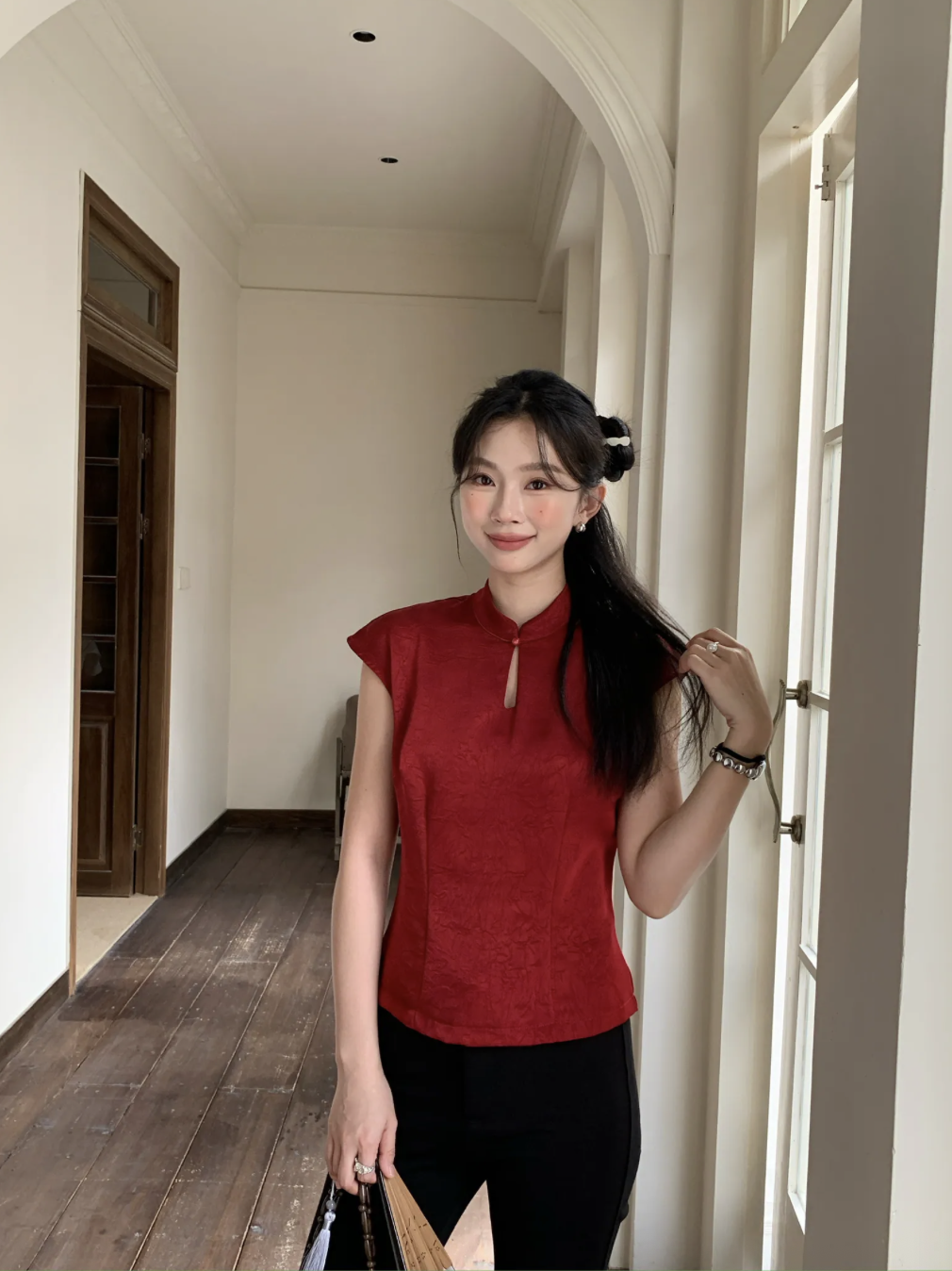 以中式提花、立领元素为主轴,结合更现代的轮廓线条,整体风格不刻意,却非常耐看。属于那种不需要多说,一穿就很有新年氛围的战服,照片里也特别加分。